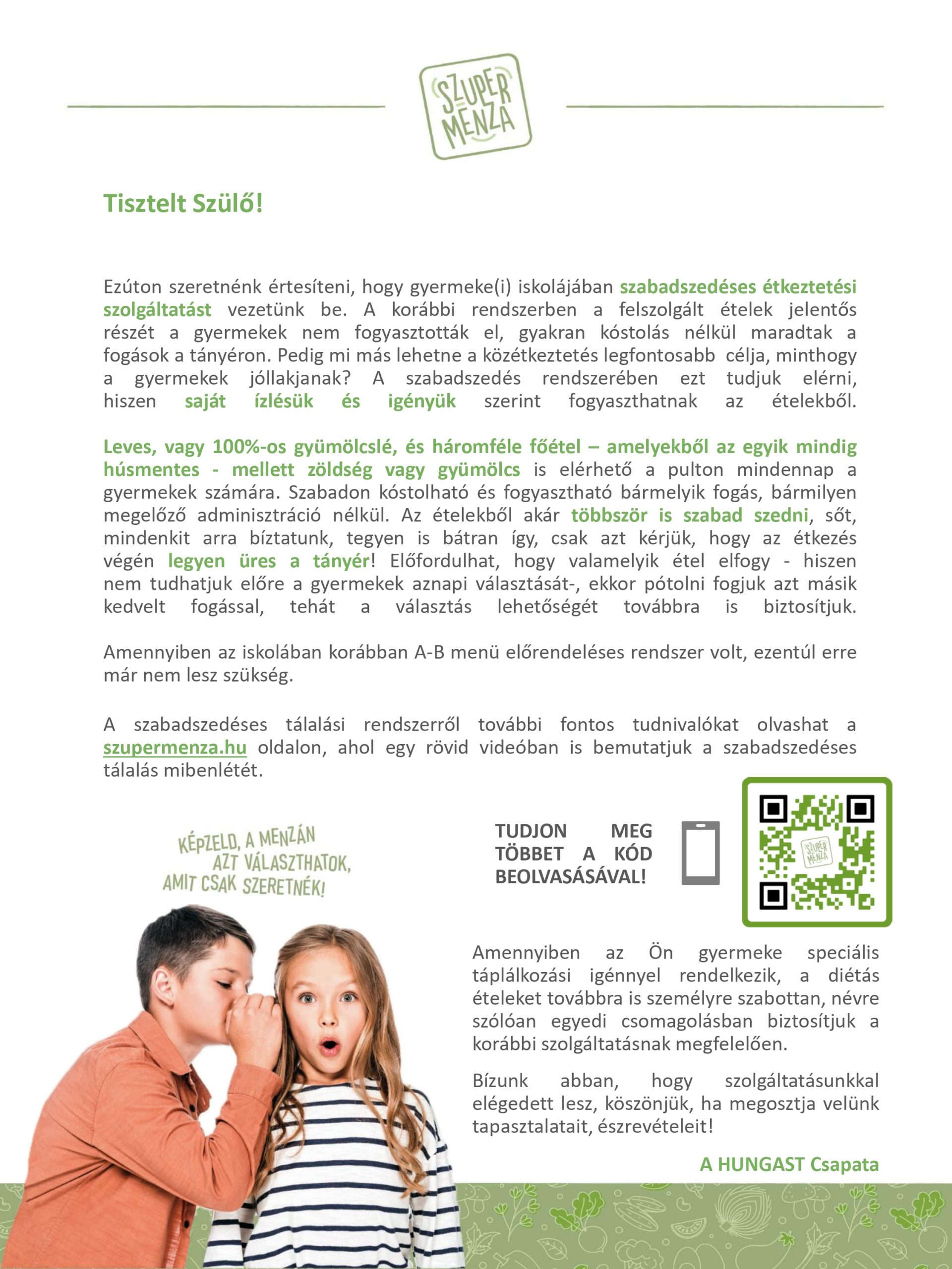 A befizetett csekk szelvény részének fotóját és a menü választás nyilatkozat fotóját legkésőbb a hónap 15. napjáig kell az iskola gazdasagi.harrerp@ebtk.hu e-mail címére visszaküldeni. 15-e után visszaküldött csekk és menüválasztás esetén már csak „A” menü igénylésére van lehetőség.